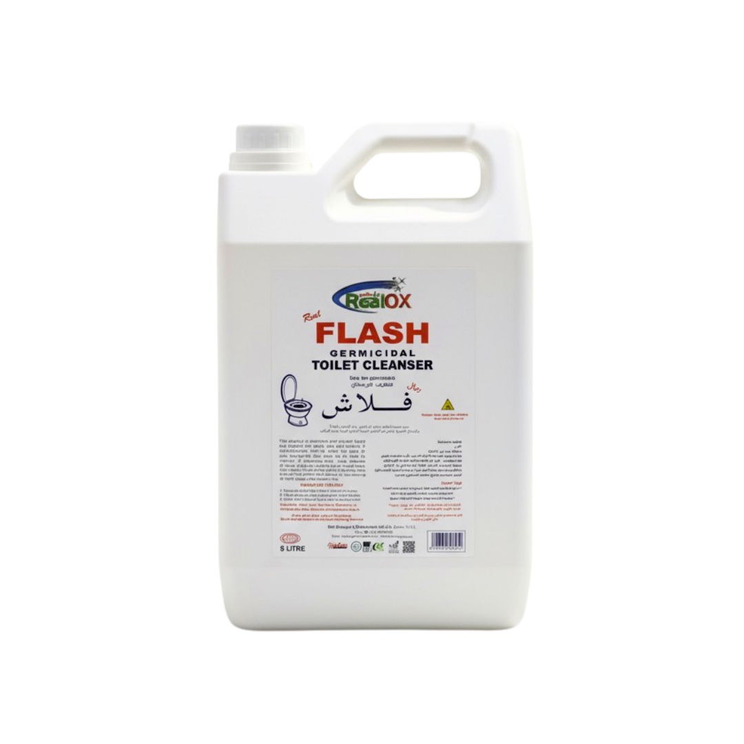 Realox Flash Germicidal Toilet Cleaner delivers powerful disinfection in a convenient 5-liter format. Formulated with germicidal agents, this professional-grade cleaner eliminates bacteria, viruses, and odor-causing microorganisms while removing stubborn stains and limescale buildup. The potent formula works efficiently on porcelain and ceramic surfaces, leaving your toilet hygienically clean and fresh. Ideal for residential and commercial applications, this bulk size offers excellent value for frequent use. Simply apply, let it work, and flush for visibly cleaner results with antimicrobial protection.